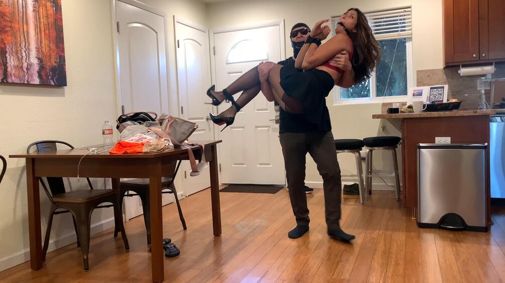 A perpetrator takes someone's wife (Lola Pearl) hostage. He is seen carrying her into the bedroom. She is ballgagged, her ankles are bound with rope and her wrists are taped together. She moans and squirms pleading for help. The perpetrator spanks her for almost struggling out of her ropes, and whips her before tying her up again. While waiting for her husband to call back he begins to suck on her stocking toes. Then takes off her top and begins to have fun with her breasts, ass and pussy. Poor woman looks into the camera desperately but no one is coming to help her.